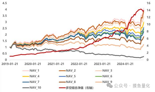 基础 Transformer 模型训练得到的因子选股效果较为有限。自 19 年开始对 样本外预测因子进行回测,按照每周最后一个交易日因子值在下周第一个交易日 按照 vwap 价格调仓,因子周频平均 RankIC 为 0.086,RankICIR0.73,年化后 为 5.24。分十组双周频回测下,年化多空收益 56%,模型分组效果单调。从 RankIC 与多空收益的角度,相比于市面上的深度学习模型平均 10%左右的 RankIC,基础 Transformer 模型因子表现较为一般。