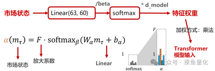 市场状态经过门控机制生成特征权重。构造市场状态后,将每日市场状态(1x63 的向量)输入模型中进行门控机制建模,门控机制为全连接层加激活函数的形式,其中全连接层经过一个缩放系数 beta 后进入激活函数,再乘以 d_model重新放大,d_model为输入特征数量,本次实验中为 60,目的是平滑特征选择的重要性,使得某些特征权重不会被过度放大。