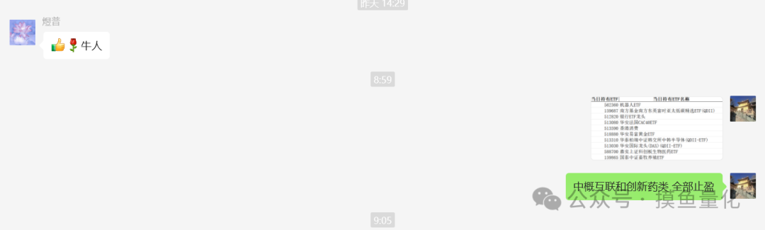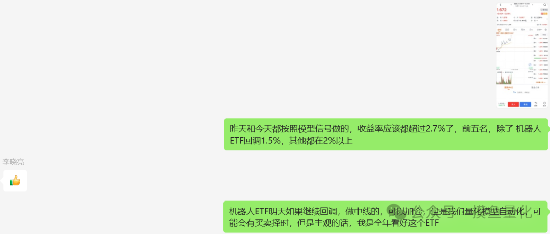 上图是最近一年半收益曲线,参与量化课程,我们的学习群每日提供实盘信号的分享和市场分析!近期群聊天内容展示如下: